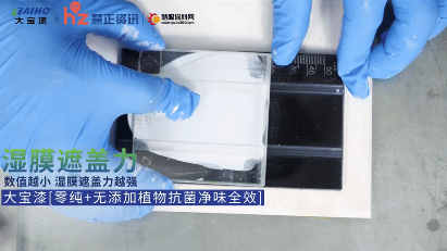 墙面涂料的遮盖力直接关系到施工效率与装修成本。在湿膜遮盖力测试中,使用丝棒将涂料涂覆在黑白对比卡上,大宝漆「零纯⁺」轻松覆盖黑色底板,实测数值表现优异,优于普通对比产品。技术人员解释,湿膜遮盖力越好,施工时涂刷次数越少,能大幅节省工时与涂料用量。
